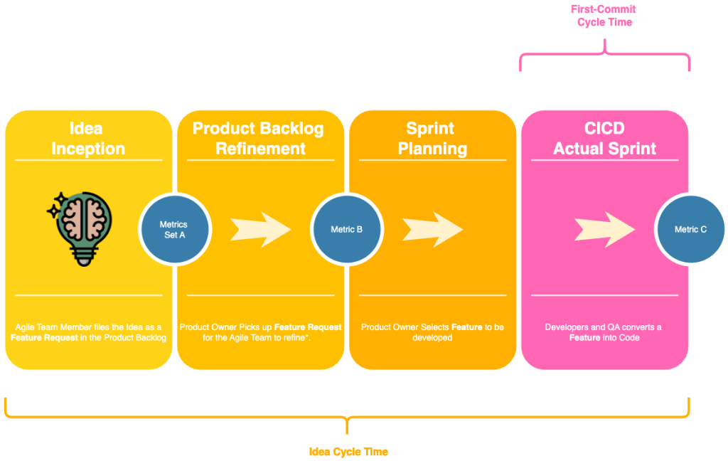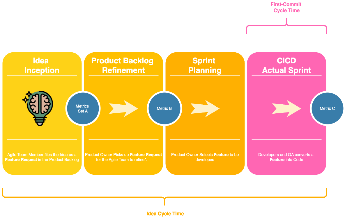 Based on these Sprint Activities, we can measure properly Idea Cycle Time and First-Commit Cycle time. The diagram below illustrates the difference between both.